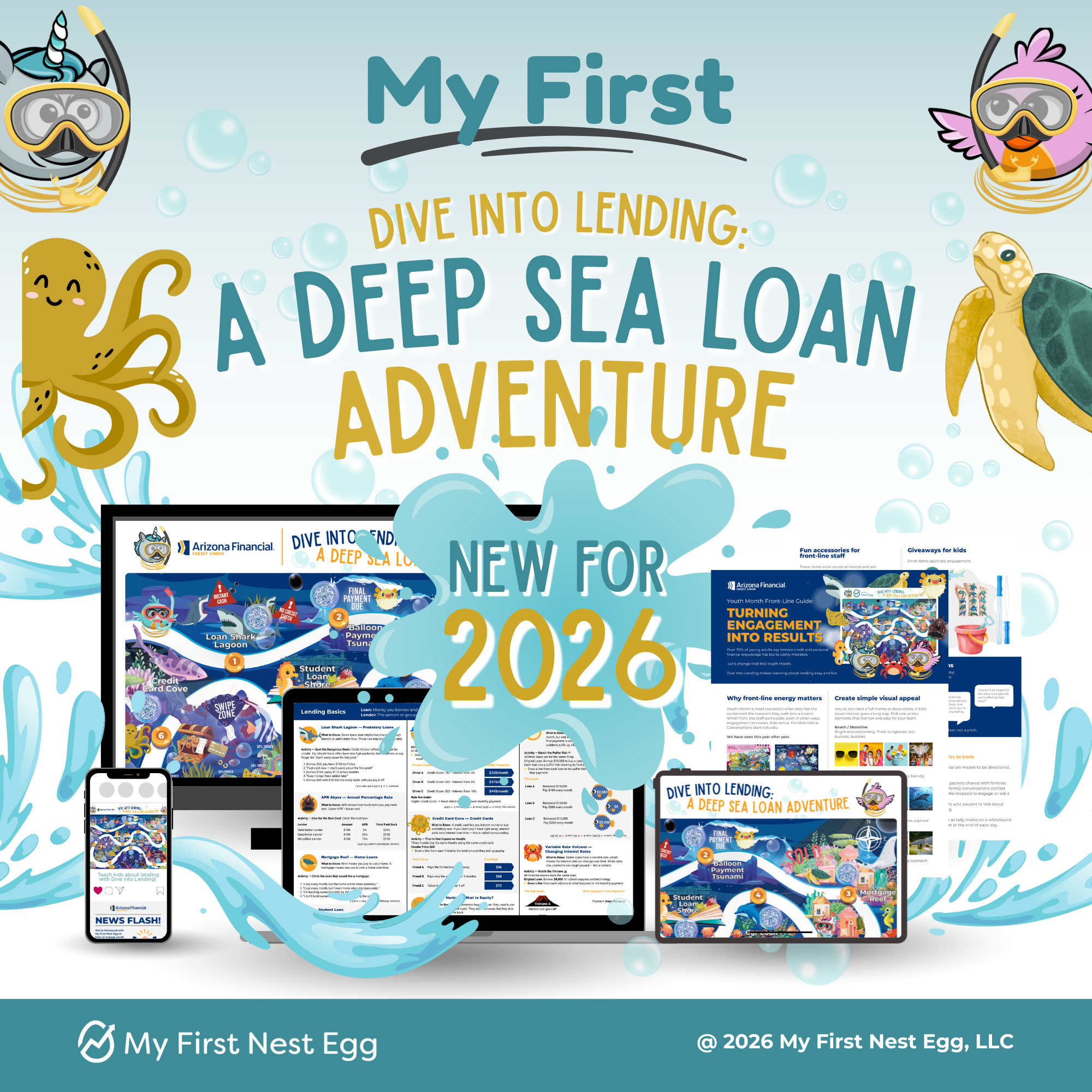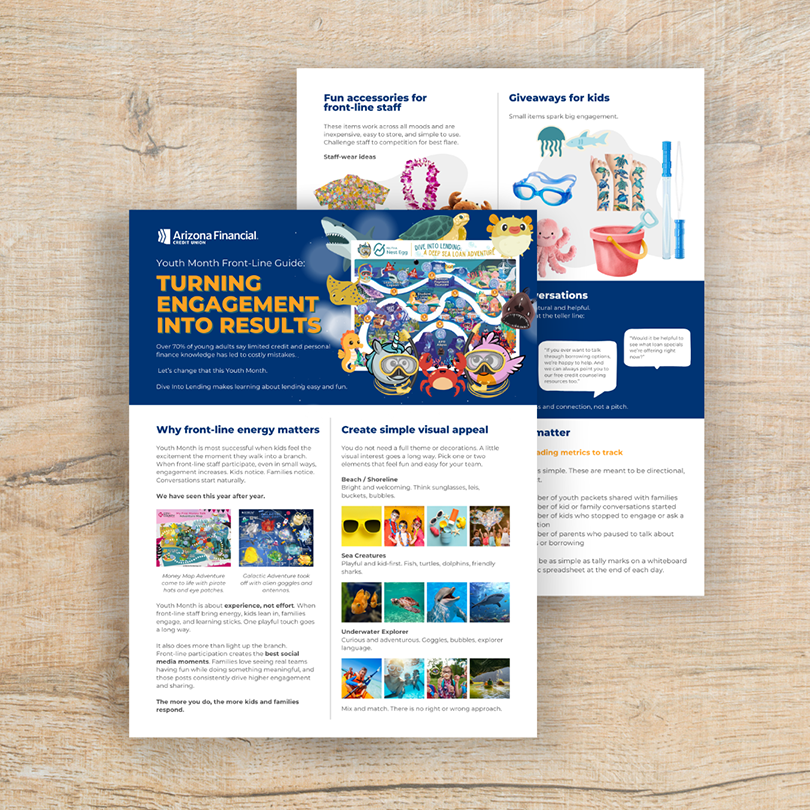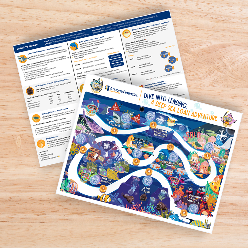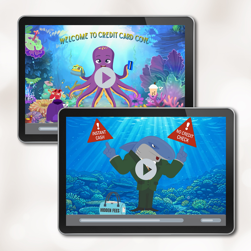 Give kids and families a clear, approachable introduction to how lending really works with Dive Into Lending: A Deep Sea Loan Adventure. This interactive, map-based experience helps young learners explore real-world loan concepts—like credit cards, car loans, student loans, interest rates, APR, and hidden loan risks—through a fun underwater journey featuring stops like Loan Shark Lagoon, Auto Loan Atoll, and APR Abyss. Short, kid-friendly videos bring each stop to life, helping concepts click in seconds. Designed to spark natural conversations in-branch and beyond, this turnkey module empowers financial institutions to educate without selling. Partners receive a Dive Into Lending Adventure Map, branch screen, smart money social post, Stellar Start newsletter, Mission Control guide, implementation guide—making it easy to engage families and build confidence around borrowing.